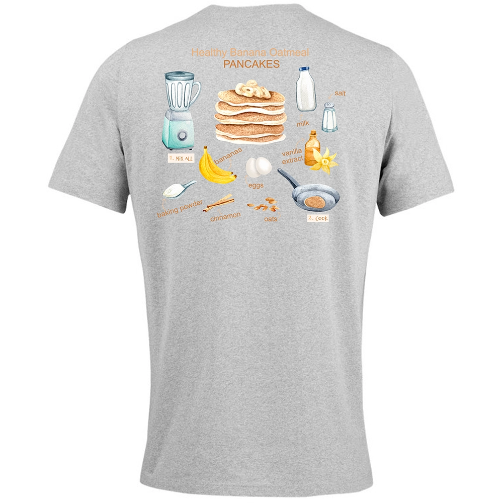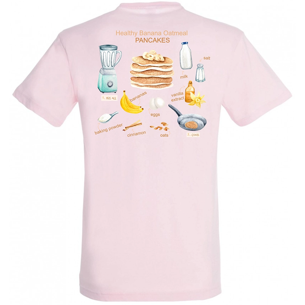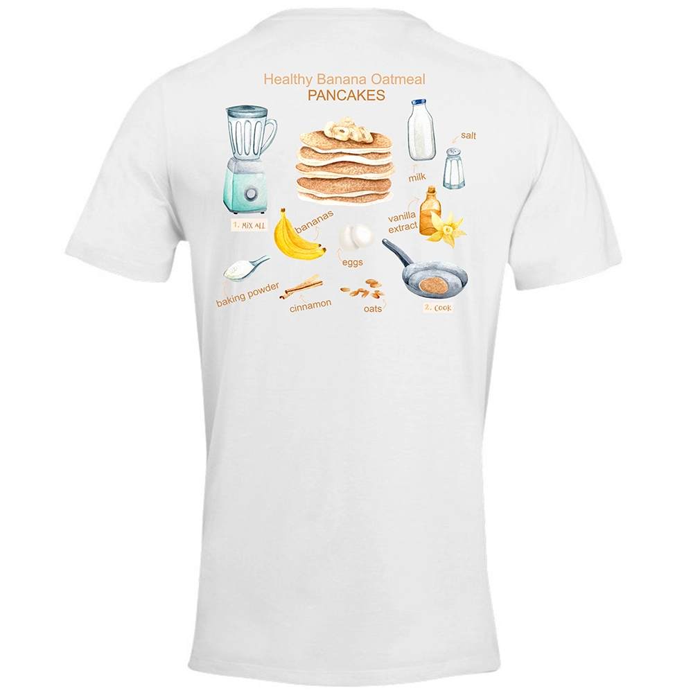 Το Pancake Banana Recipe tee έχει όλη αυτή τη χαλαρή, cozy και ανεπιτήδευτα χαρούμενη ενέργεια που θυμίζει πρωινό στο σπίτι, αγαπημένες γεύσεις και μικρές καθημερινές απολαύσεις. Μπροστά, το σχέδιο κρατάει το concept ήσυχο και cute. Πίσω, η σύνθεση ανοίγει σαν illustrated recipe και δίνει στο tee playful χαρακτήρα, ζεστασιά και μια πολύ ευχάριστη αισθητική.