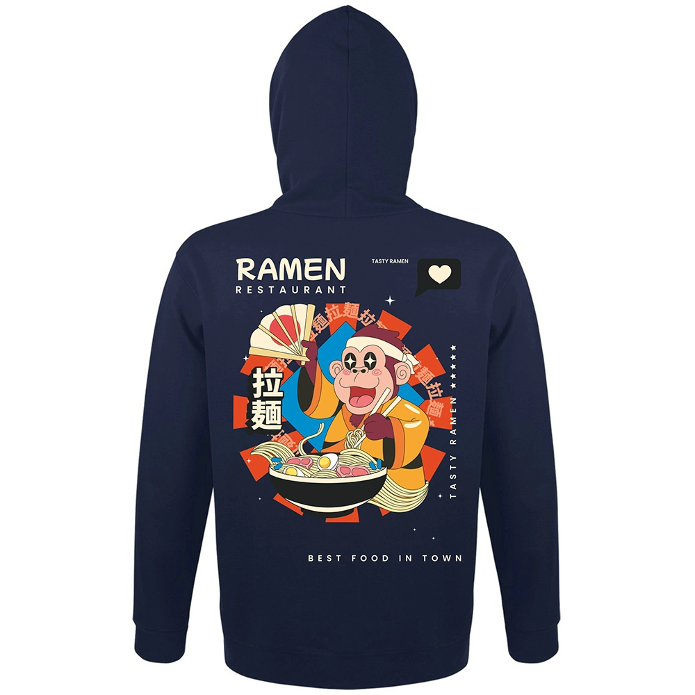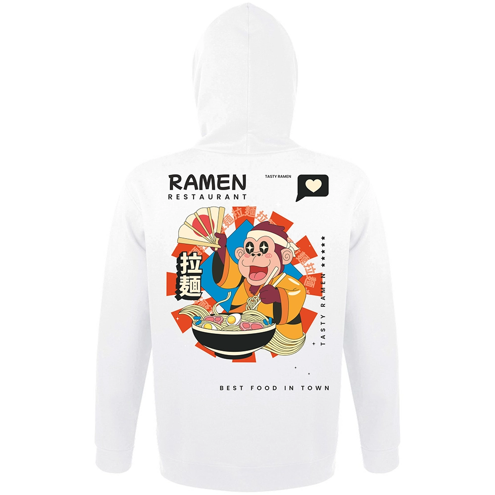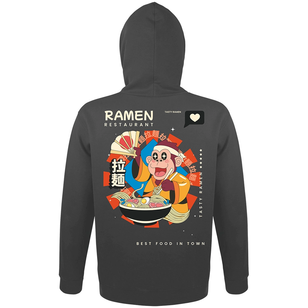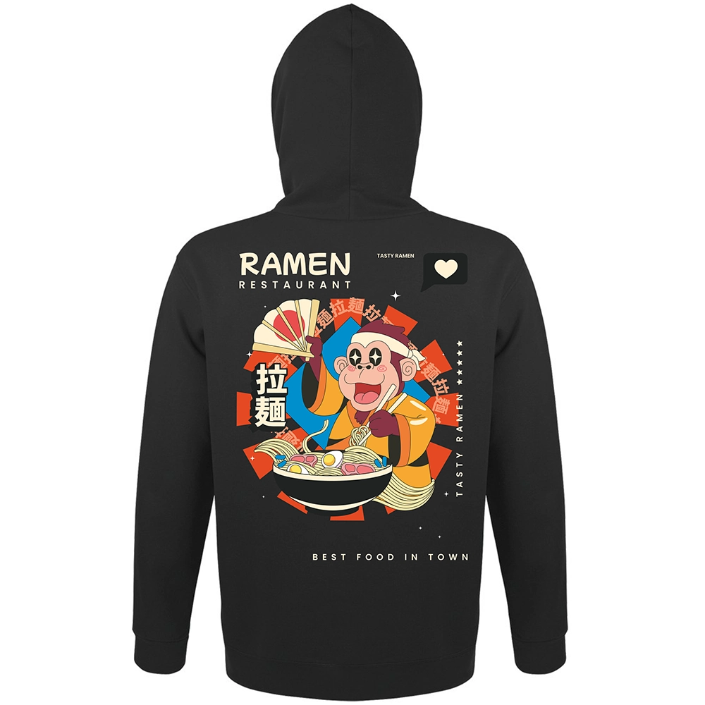 Το Ramen Restaurant hoodie έχει playful asian χαρακτήρα, έντονο illustration ύφος και αυτό το fun visual storytelling που κάνει το σχέδιο να μοιάζει σαν poster από φανταστικό ramen spot. Η μαϊμού, το bowl, τα σύμβολα και οι λεπτομέρειες στην κουκούλα δίνουν στο κομμάτι μια πιο ολοκληρωμένη ταυτότητα — σαν να έχεις πάνω σου ένα μικρό, ζωντανό concept universe.