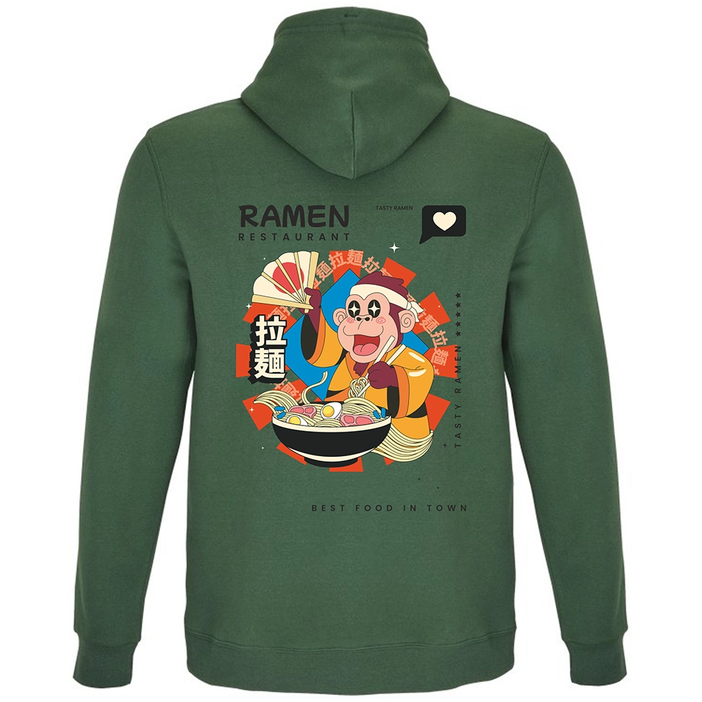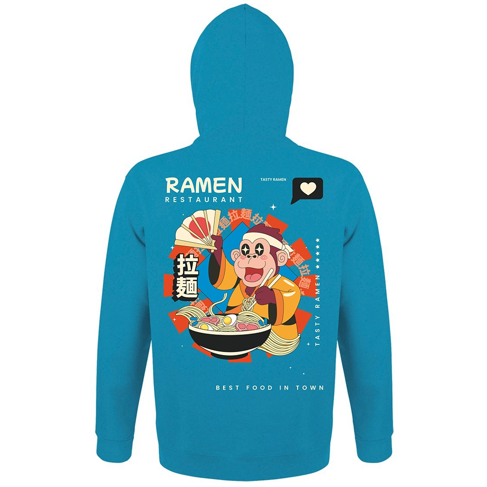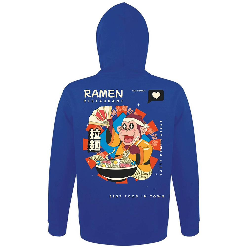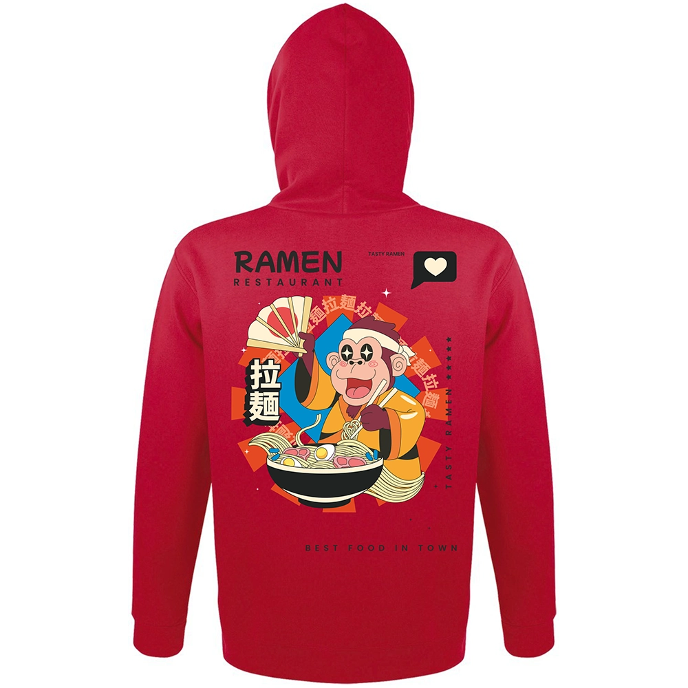 Το Ramen Restaurant hoodie έχει playful asian χαρακτήρα, έντονο illustration ύφος και αυτό το fun visual storytelling που κάνει το σχέδιο να μοιάζει σαν poster από φανταστικό ramen spot. Η μαϊμού, το bowl, τα σύμβολα και οι λεπτομέρειες στην κουκούλα δίνουν στο κομμάτι μια πιο ολοκληρωμένη ταυτότητα — σαν να έχεις πάνω σου ένα μικρό, ζωντανό concept universe.